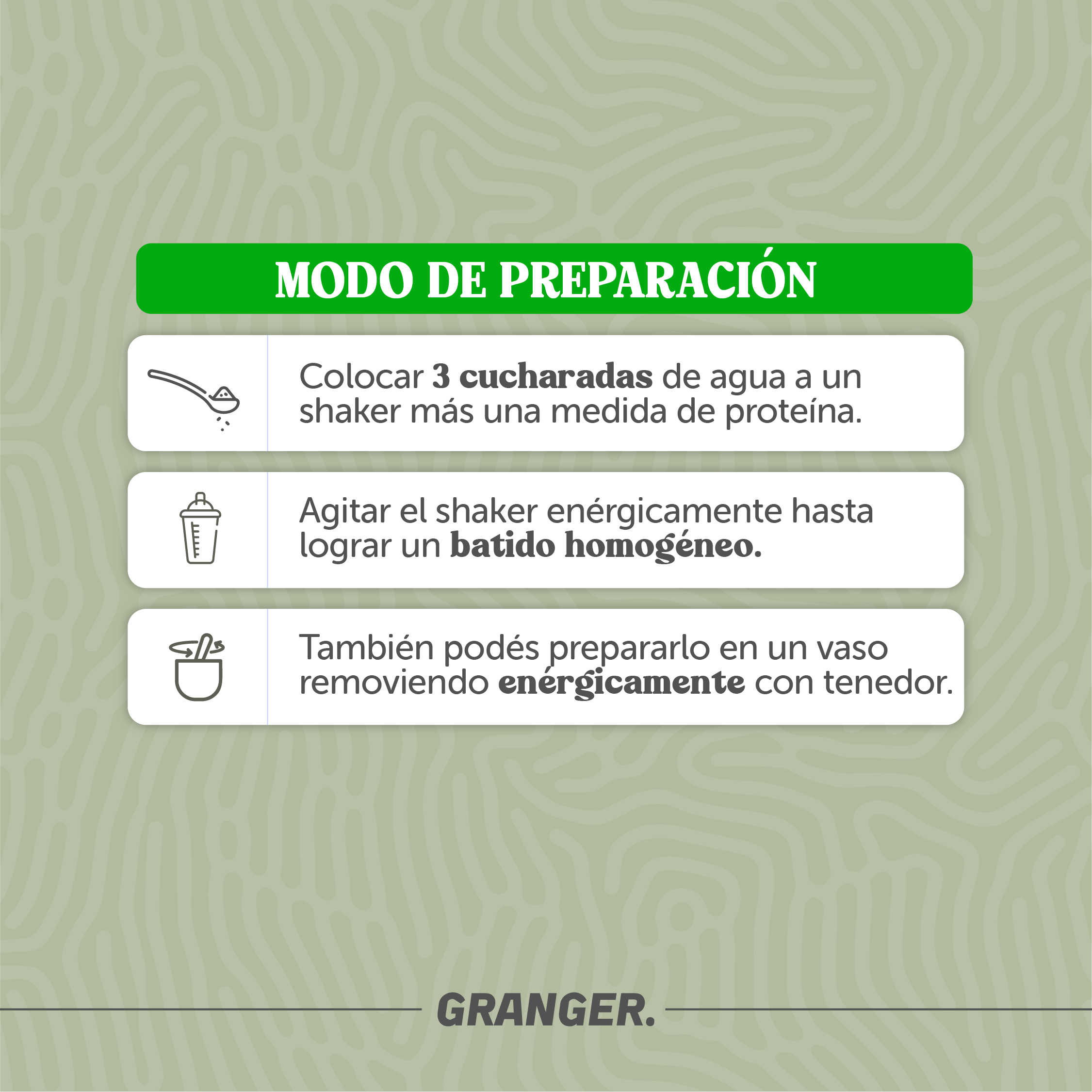 Añadir una medida del producto en polvo en 300 ml de agua o cualquier bebida y batir bien.