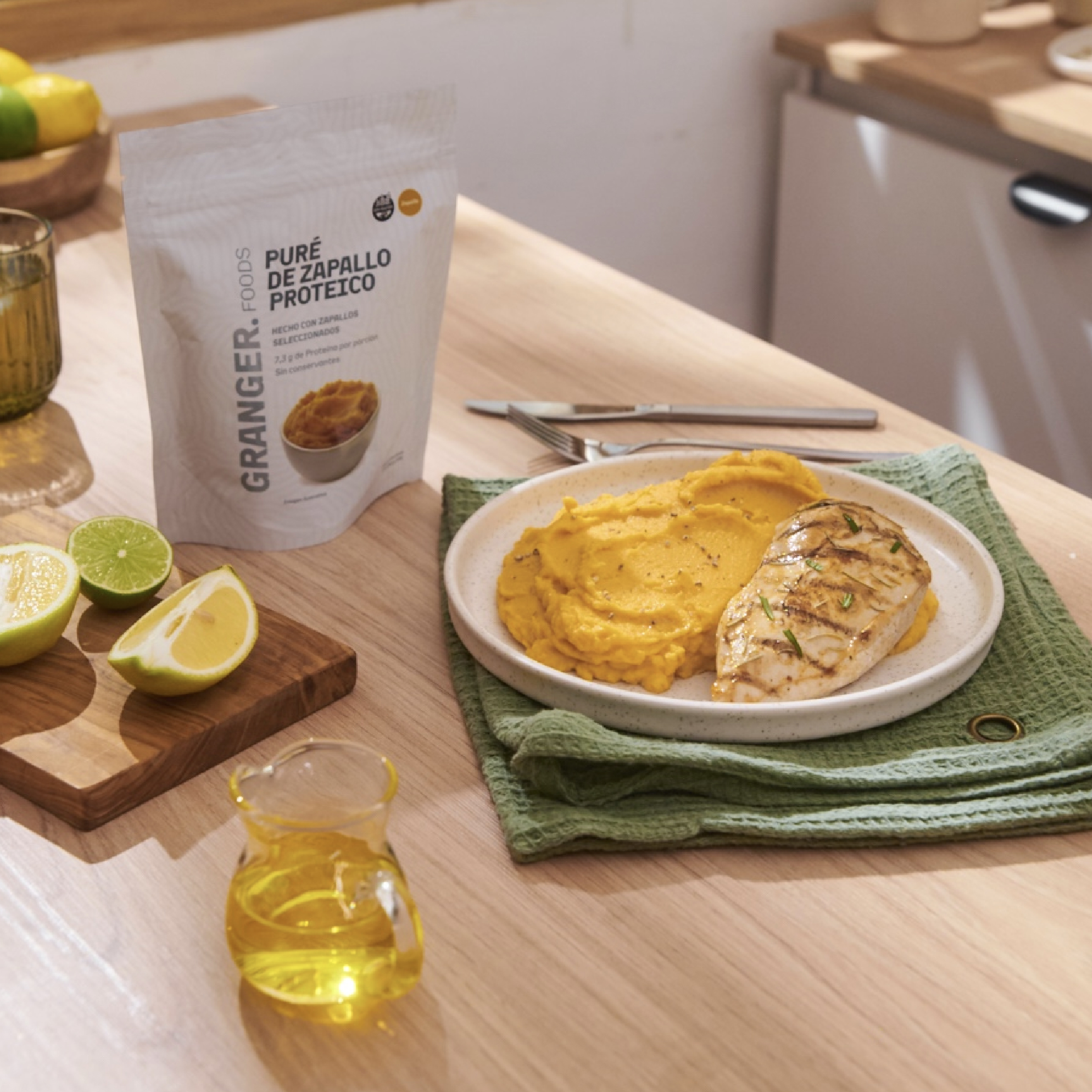 Nuestro puré combina lo mejor de dos mundos: el sabor suave, cremoso y naturalmente dulce del zapallo con un perfil proteico superior. Se prepara en minutos con solo agua y dos cucharadas de aceite, transformando tus almuerzos y cenas en algo rico y nutritivo.